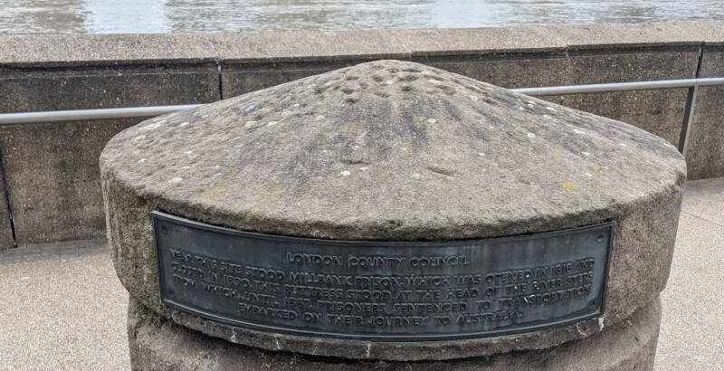 The bollard originally stood at the head of the river steps opposite Millbank Prison on the site of which the Royal Army Medical College was built and from where until 1867 prisoners sentenced to transportation embarked on their journey to Australia.