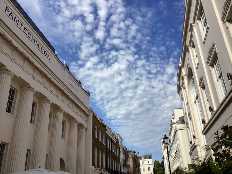 Originally the name of a large establishment here, in Motcomb Street, opened in May 1831. It combined a picture gallery, a furniture shop, and the sale of carriages, while its southern half was a sizeable warehouse for storing furniture and other items. Seth Smith, whose family were originally from Wiltshire, was a builder/property developer in the early 19th century, and constructed much of the new housing in Belgravia, then a country area. Their clients, the dwellers of the new district, required storage facilities and this was built on an awkward left-over triangular site with a façade of Greek style Doric columns and was called Pantechnicon, pseudo-Greek for "pertaining to all the arts or crafts".
