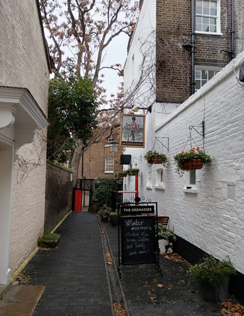 The Grenadier is a public house in Belgravia, London. It was originally built in 1720 as the officers' mess for the senior infantry regiment of the British army, the 1st Regiment of Foot Guards, and located in a courtyard of their barracks. It was opened to the public in 1818 as The Guardsman,and subsequently renamed in honour of the Grenadier Guards' actions in the Battle of Waterloo.[1]