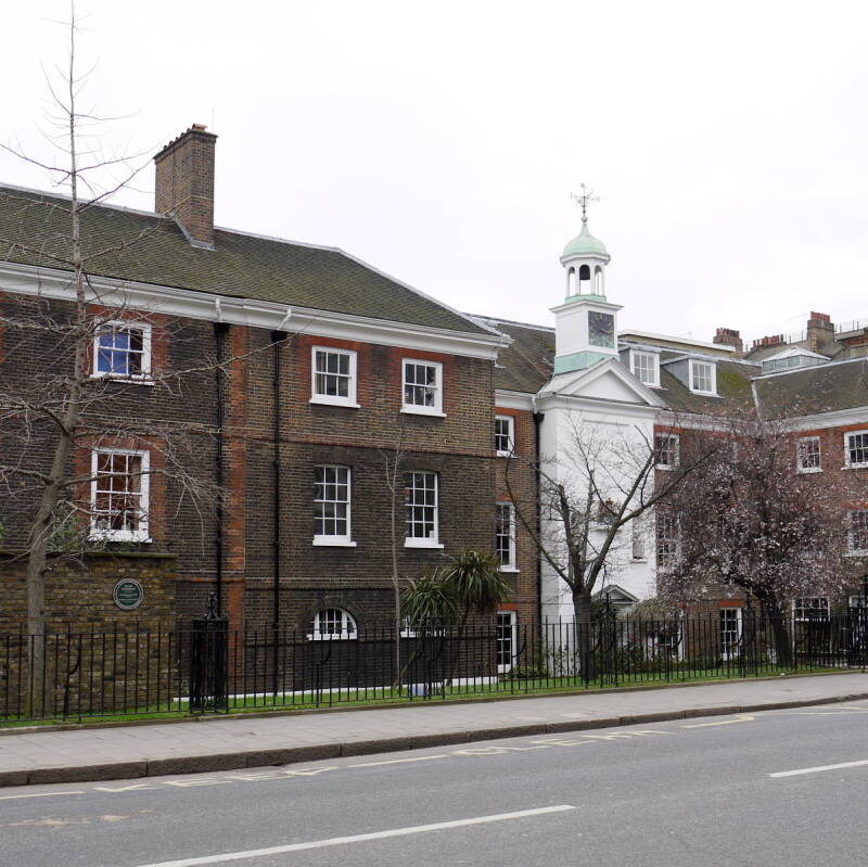 The street includes some "outstanding" examples of Queen Anne and Georgian townhouses. The older buildings, many dating from the original laying-out of Queen Square in 1704-5, are found at the western end. Queen Anne's Gate is formed from two older streets, Park Street, to the eastern end and part of the Christ's Hospital estate, and Queen Square, to the western end and developed by the South Sea Company.[2] Until 1873 the two were divided by a wall, with the Statue of Queen Anne (see below) set within it.[3] In 1874 the wall was demolished, Park Street and Queen Square were renumbered and the whole was renamed Queen Anne's Gate.