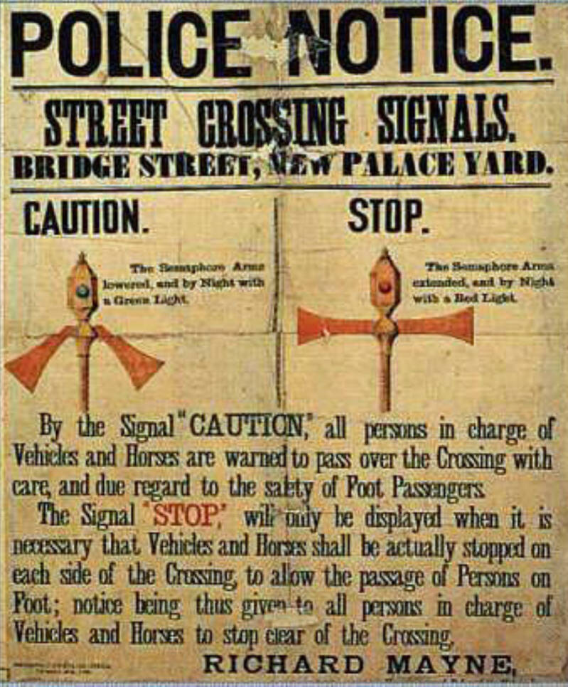 Taking railway signals as his inspiration, railway engineer John Peake Knight devised the first traffic light used to control traffic. The design consisted of two vertical arms with two gas lamps. During the day, when the arm was in the vertical position it indicated “go”, while in horizontal position it indicated “stop”; and at night gas lamps with the colours green for “go” and red for “stop” were used, operated manually by a policeman. A few months after its installation, an accidental explosion seriously injured the policeman in charge of its operation and the traffic light was removed.