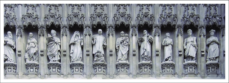 on the façade above the Great West Door of Westminster Abbey (from left to right): Maximilian Kolbe, Manche Masemola, Janani Luwum, Grand Duchess Elizabeth of Russia, Martin Luther King, Oscar Romero, Dietrich Bonhoeffer, Esther John, Lucian Tapiedi and Wang Zhiming.